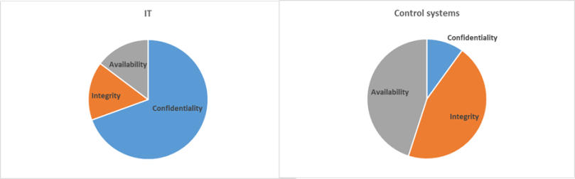 In traditional IT, security thinking has been dominated by confidentiality. This is in most cases justified; the data itself is the valuable asset (think credit card information, medical journals, police records, accounting, business plans, etc.). In control systems, the real value is governed by the process control by the control system assets, and availability is extremely import, as well as integrity. Confidentiality on the other side may be less important.