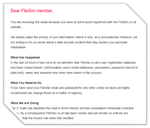 Rita designer was working on a new project and was on a deadline. She was an avid reader of the magazine “Web Designer“, that has lots of great content on UX and design patterns. Usually Rita wouldn’t base her client designs on stuff from a magazine but this time she found some really nice UX effects described in the latest issue that she wanted to try out. She created an account on their fileshare “FileSilo“, and quickly found the free stuff she could download when she’d bought the latest Web Designer issue. When she signed up she used her e-mail address and the password she always used for her non-critical online accounts, which in her opinion was pretty much anything except for her banking portal and her insurance portal.