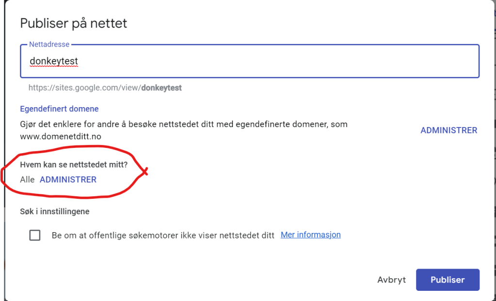 First, we create a site that we want to be public. Here’s an example of a published Google Site: https://sites.google.com/view/donkeytest/start. We publish this one as visible for everyone.