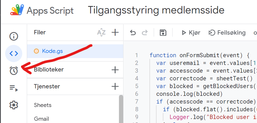 In App Script, we add the Sheets + Gmail services. We create a function to be triggered each time the form is submitted. Our function is called onFormSubmit. We click the “trigger button” in the editor to add a trigger to make this happen.
