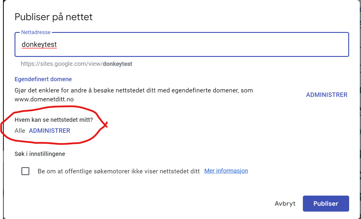 First, we create a site that we want to be public. Here’s an example of a published Google Site: https://sites.google.com/view/donkeytest/start. We publish this one as visible for everyone.