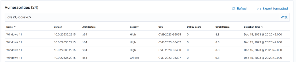 A critical element for managing this in practice is a good discovery function. There are many vulnerability management systems with this functionality, as well as various vulnerability scanners. For managing a network, we can use Wazuh, which has a built-in vulnerability discovery function. The software unfortunately does not support direct prioritization and enrichment in the default vulnerability dashboard, but it can export reports as CSV files for processing elsewhere, or we can create custom dashboards. Here’s how the default dashboard for a single agent looks.
