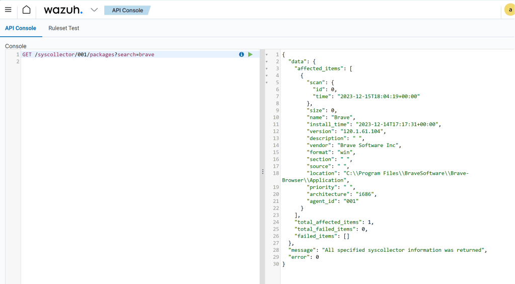 With news like this, it would be a good idea to research which versions are being exploited, and to check the software inventory for installs of this. WIth Wazuh, there is unfortunately no easy way to do this across all agents, because the inventory of each agent is its own sqlite database on the manager. There is a Wazuh API that can be used to loop over all the agents, looking for a particular package. In this case, we are using the Wazuh->Tools->API Console to demo this, searching for “brave” on one agent at the time: