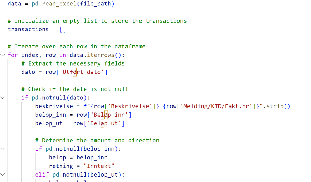 {‘Dato’: ‘24.02.2025’, ‘Beskrivelse’: ‘VIPPS NORSK TIPPING *8812 21.02 NOK 50.00 VIPPS NORSK TIPPING Kurs: 1.0000’, ‘Beløp’: -50.0, ‘Retning’: ‘Utgift’, ‘Kategori’: ‘Annet’}, {‘Dato’: ‘21.02.2025’, ‘Beskrivelse’: ‘REMA 1000 BREIDABLIKK *8812 20.02 NOK 97.20 REMA 1000 BREIDABLIKK Kurs: 1.0000’, ‘Beløp’: -97.2, ‘Retning’: ‘Utgift’, ‘Kategori’: ‘Dagligvarer’},