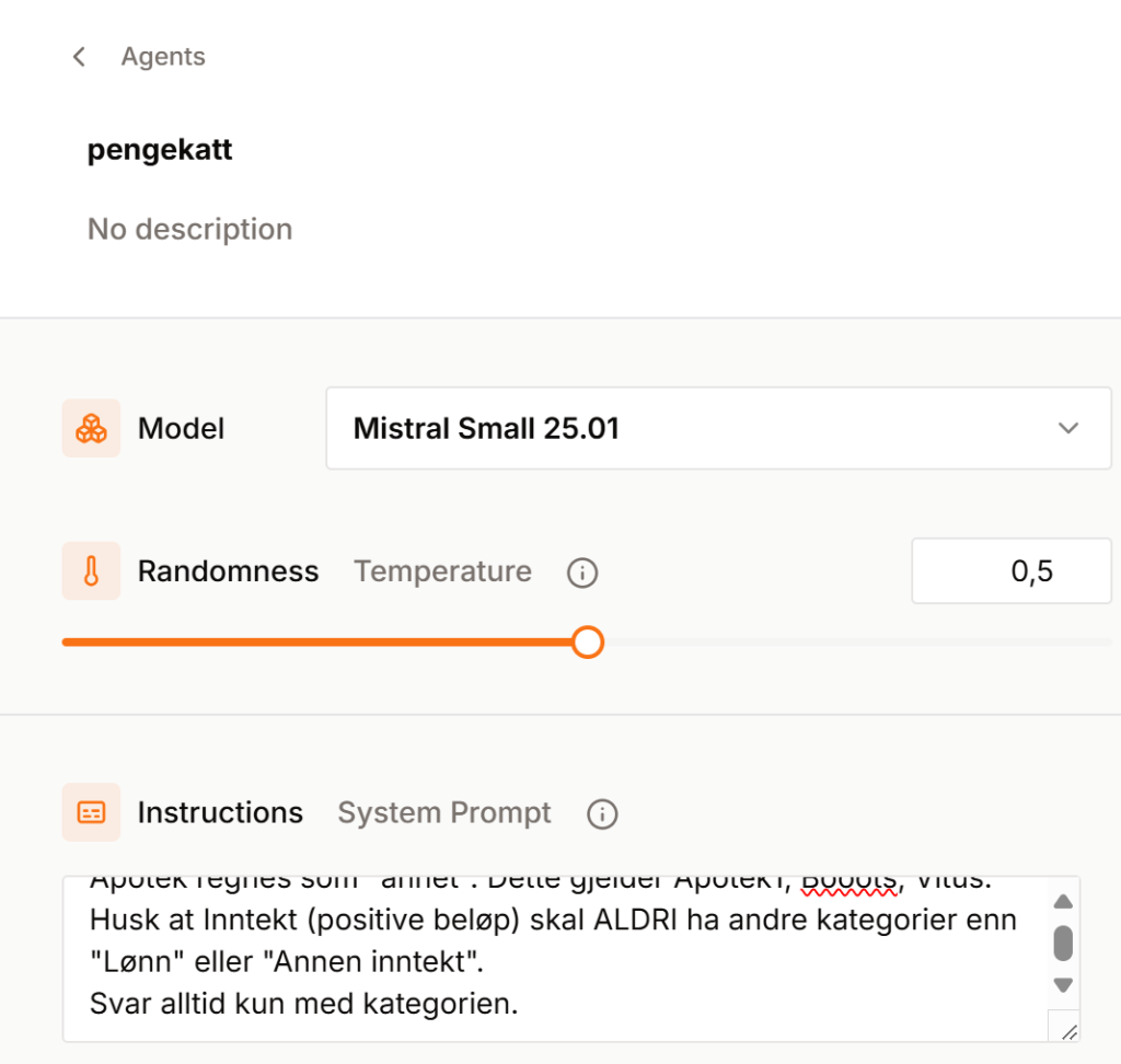 I asked it to categorize first income using only two categories: “Salary” or “Other income”. I gave it more categories for expenses, and told it not to mix the categories from income to expenses and vice versar. It still got confused a few times, but worked well. The agent can be deployed to both an API and the chatbot “Le Chat”. The agent expects a text string to describe the transaction in the form of a number followed by a textual description. Here’s how it works in Le Chat: