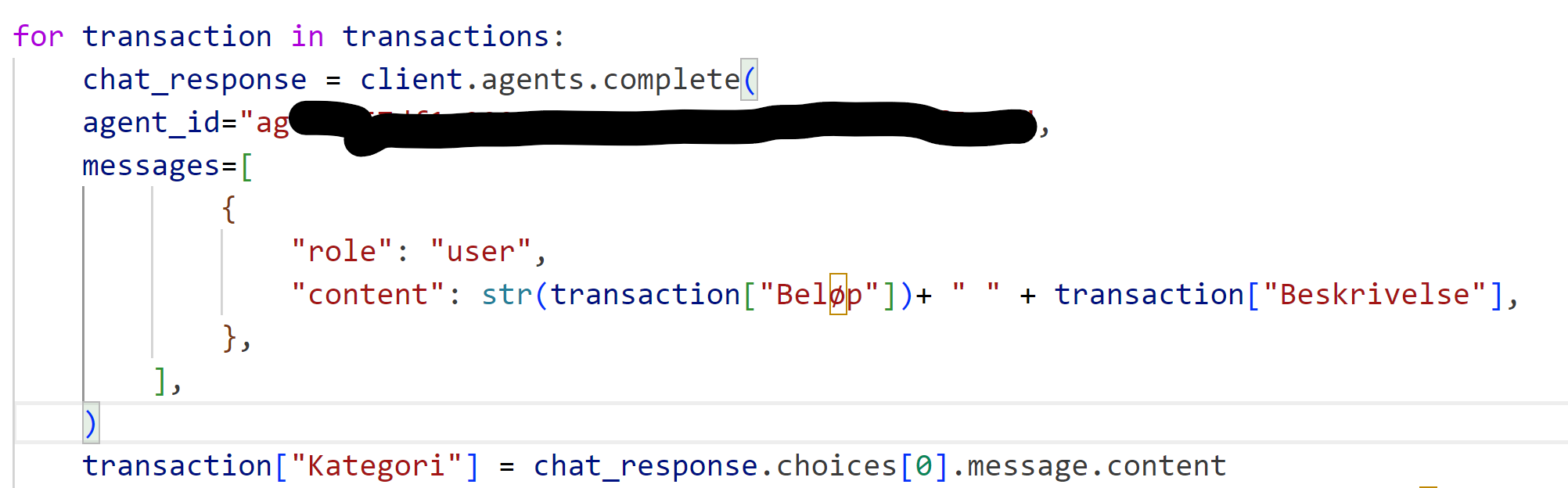 Then it iterates over the transactions and uses the agent API to ask for the category: