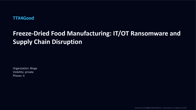 This platform supports executing the exercise within the platform – including a built-in chat, AI advisor for various roles participating, generating a hotwash report – all very useful features in an exercise. But it is also possible to use AI systems to generate the exercise and to download it in more traditional formats, such as PowerPoint for local use. Then the files and data in the cloud can be deleted after generation and the time it is available to possible threat actors is significantly reduced.