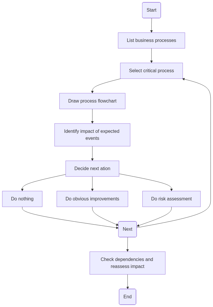 The first step to reduce the risk to the organization’s core processes from security incidents is to know what those core processes are. Mapping out key processes and how technology is supporting them is therefore an important step. A practical approach to describe this on a high level is to use SIPOC – a table format for describing a business process in terms of Suppliers – Inputs – Process – Outputs – Customers. Here’s a good explanation form software vendor Asana.